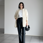 Irena je ztělesněním čistoty a neuvěřitelné hebkosti. Tento kardigan s jemným „chlupatým“ efektem a čistými liniemi bez límce působí nesmírně elegantně a zároveň útulně. Díky svému minimalistickému zapínání a splývavému střihu je ideální volbou pro ty, kteří hledají sofistikovaný kousek, který pohladí po těle i po duši.