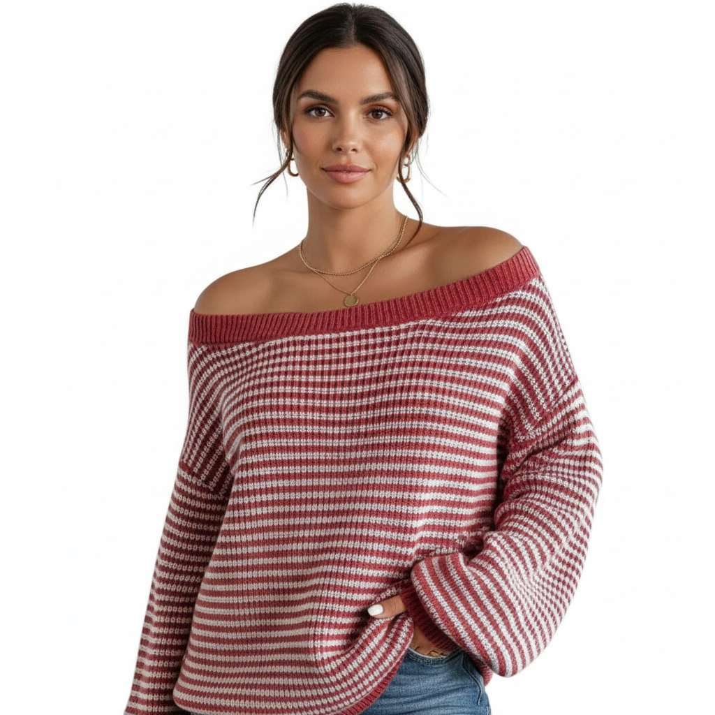 Michaela - Pohodlný Pruhovaný Svetr s Dlouhým Rukávem a Spadlým Ramenem