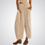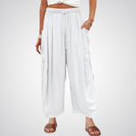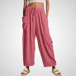 Objevte dokonalé spojení uvolněného stylu a maximálního pohodlí s těmito širokými kalhotami z lehké směsi lnu a bavlny. Jsou navrženy pro dny, kdy se chcete cítit nespoutaně – ať už procházíte letní pláží nebo si užíváte kávu v centru města. Pružný pas se stahovací šňůrkou se přizpůsobí vaší postavě, zatímco objemné boční kapsy dodávají kalhotám moderní, lehce rustikální charakter. Tento kousek je ztělesněním letní pohody, která nikdy nevyjde z módy.
